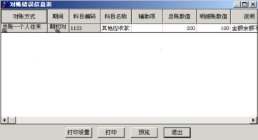 (此時的現(xiàn)象:退出個人往來期初錄入界面,則“其它應(yīng)收款”期初余額為200元。但明細(xì)記錄中顯示的是100元,這樣就造成了“總賬和個人往來輔助賬對賬不平”。)