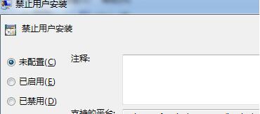 2、找到“計算機配置”-->“管理模板”-->“windows組件”-->“Windows Installer”-->有個“禁止用戶安裝”的配置項,把它改成未配置,如下圖所示。
