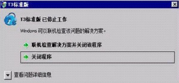 雙擊用友T3標(biāo)準(zhǔn)版,提示T3標(biāo)準(zhǔn)版已停止工作,如圖下: